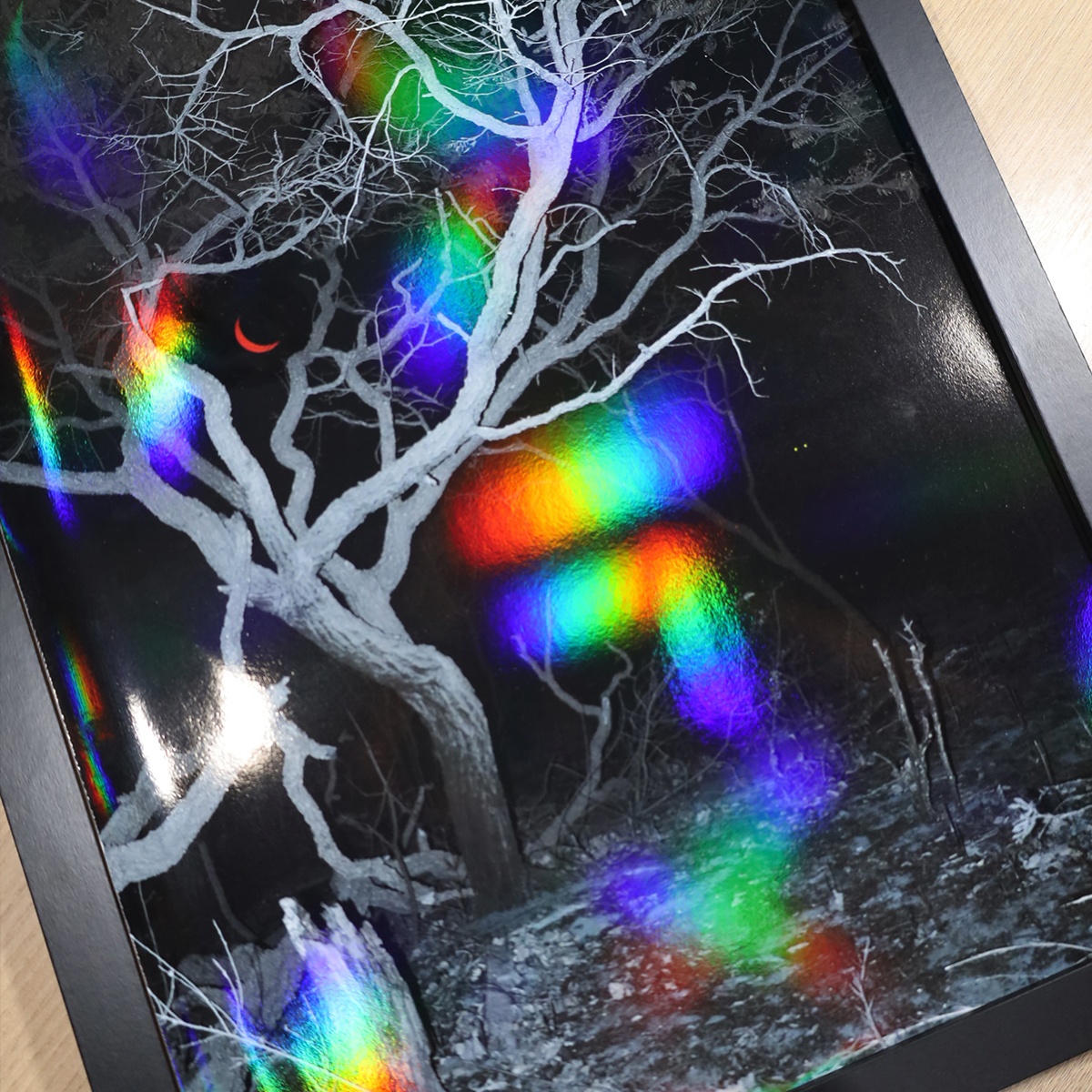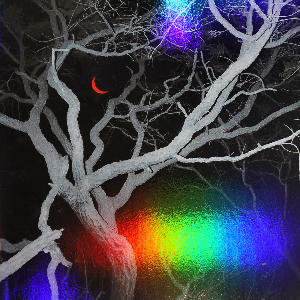 Created in a black and white palette, the holographic finish introduces subtle rainbow reflections, reminding us that even in the darkest moments, there’s always a trace of light and color.
